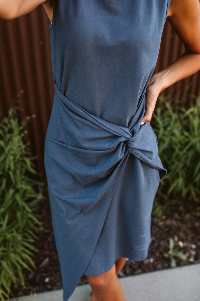 The Believe It Or Knot Dress in Blue is a perfect piece for the days you want a chic comfortable look. It features a crew neckline, tank sleeves, side knot detail, and a layered look on the bottom of the dress where it drapes longer. Try layering with a cardigan for a cozy look.