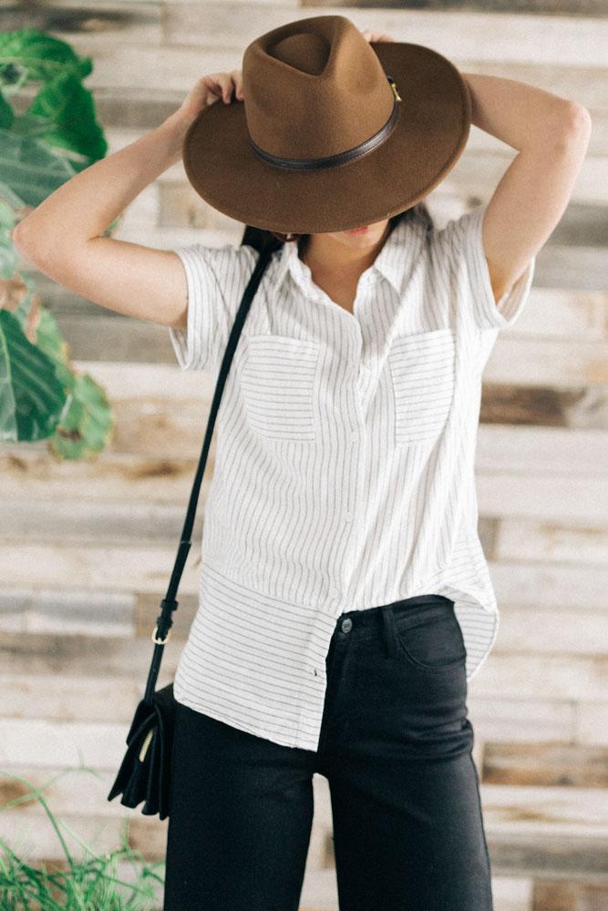 Transition with the Casey Striped Button Down Top. This piece is easy to throw on and be out the door. The rolled sleeves and pocket detailing will add an edgy detail to any outfit. Wear by itself or pair with a cardigan for those chilly days.