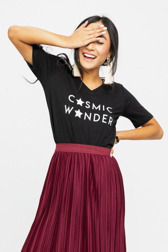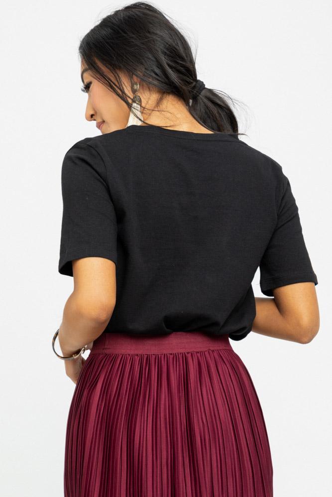 Perfect black tee for a perfect casual outfit. Pair this comfortable top with jeans, a fun floral skirt, or your favorite cut offs. It's soft, cute, and easy to style.