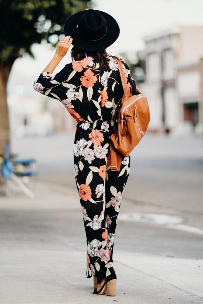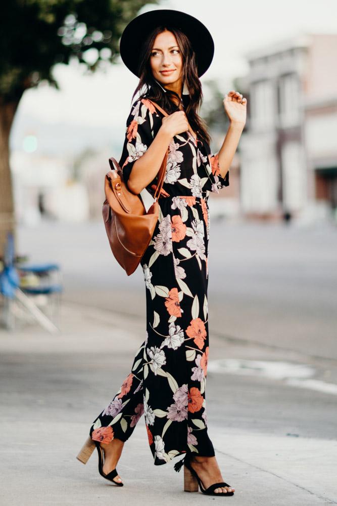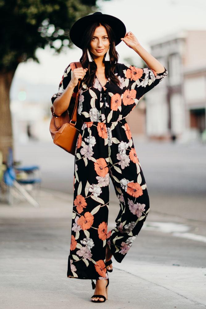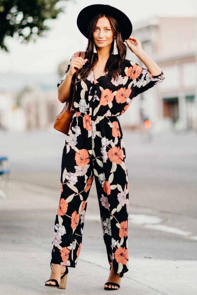 Our Hepburn Floral Jumpsuit will flow with you wherever you may go! Featuring wide leg a chic pink and white floral print, shapes fluttering sleeves, a V-neckline with a tie detail and seamed bodice. Fitted elastic waist, and wide pant legs with diagonal front pockets.