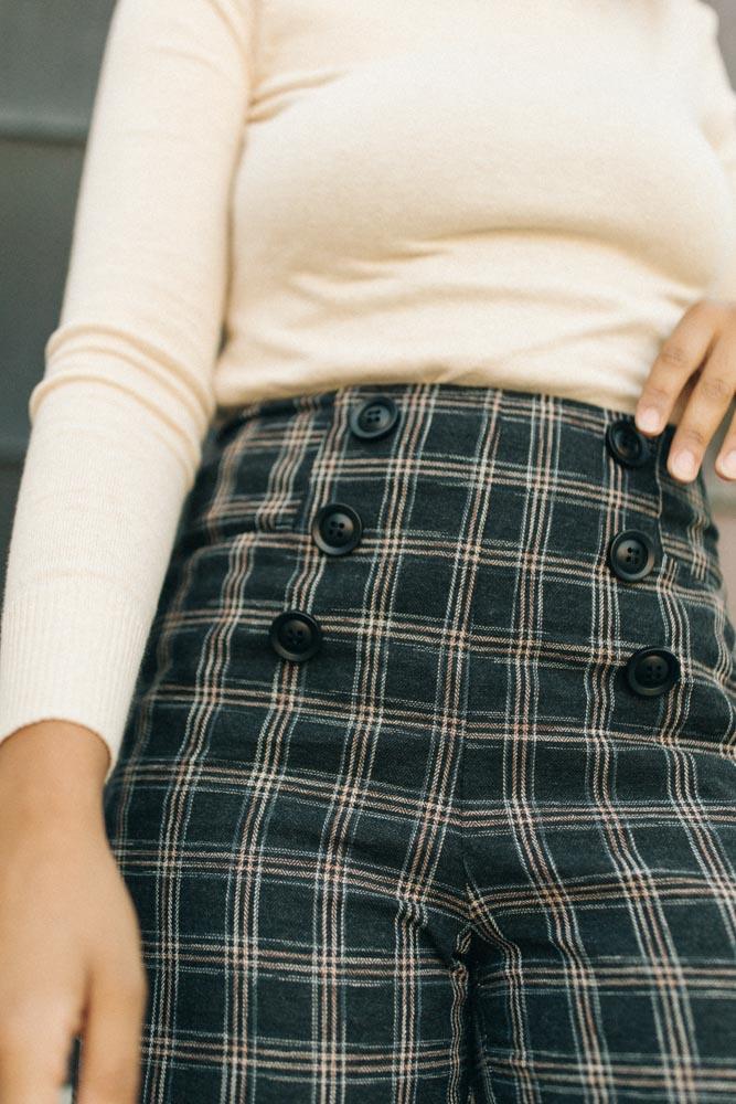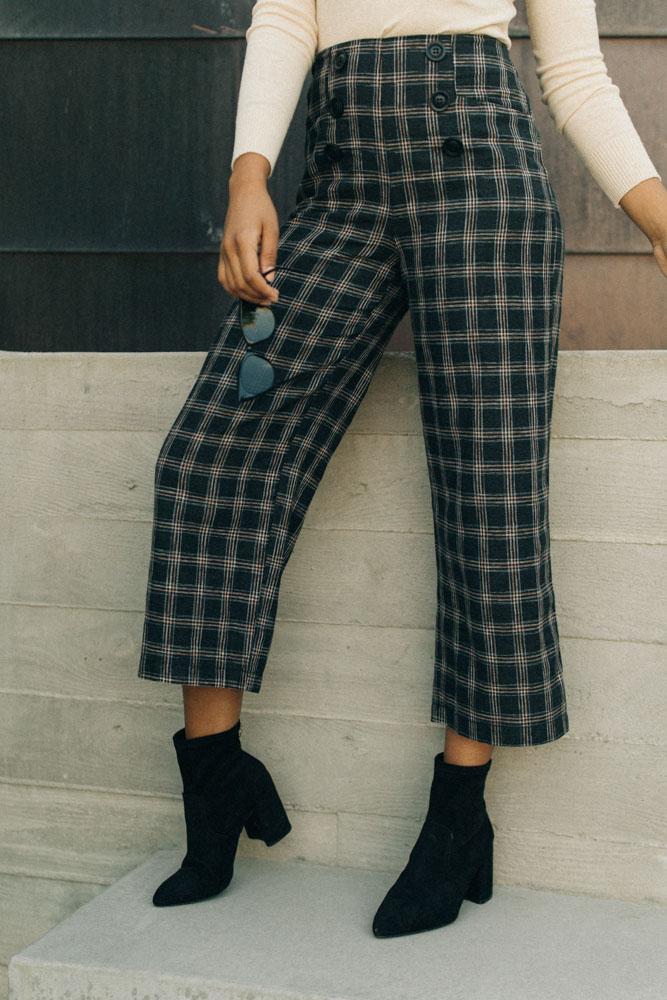 The High Waist Button Plaid Culottes feature a charcoal, white, beige and light blue plaid print. High waist with six faux buttons on the front and pockets. Wide leg with an ankle length. Hidden zipper and clasp closure in the back.