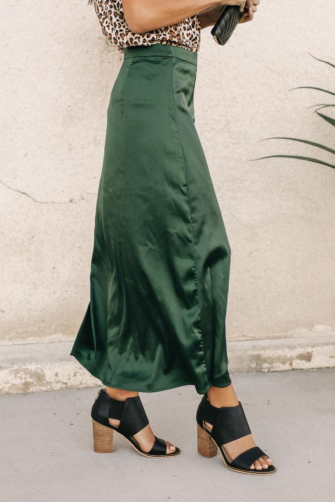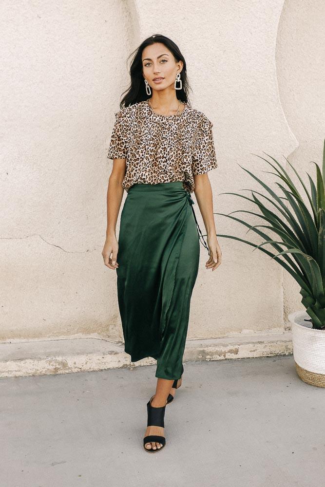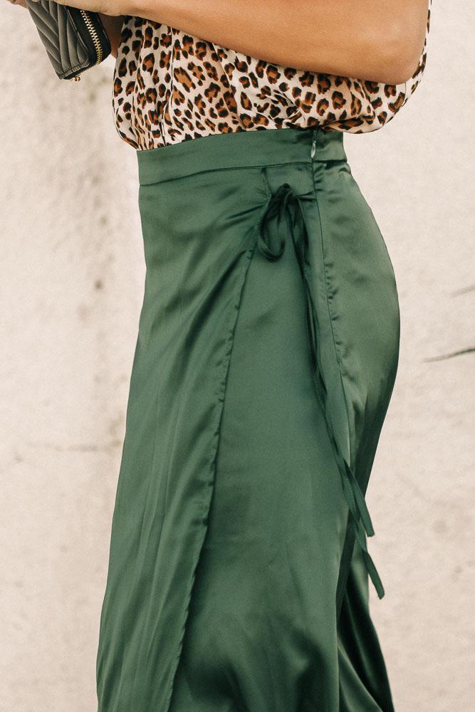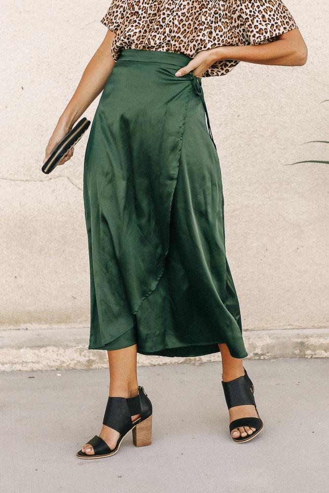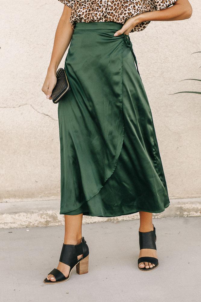 Satin Faux Wrap Skirt in Emerald