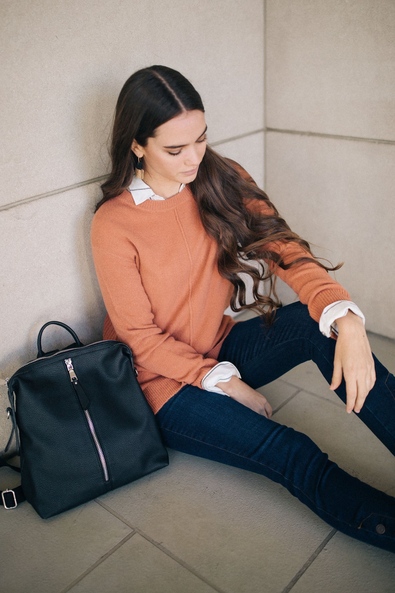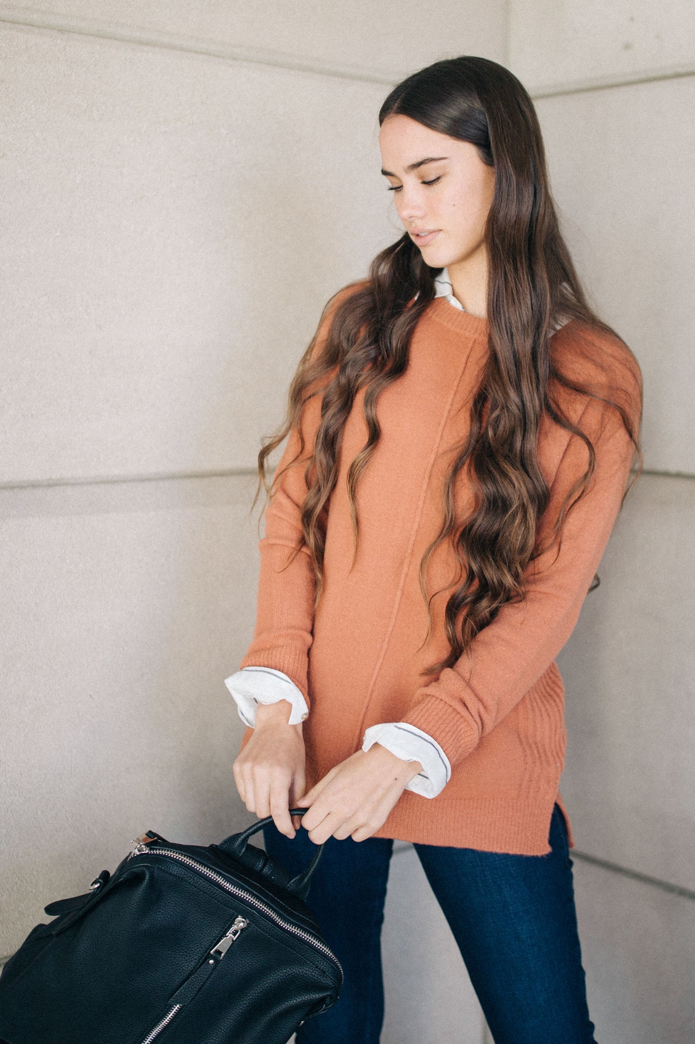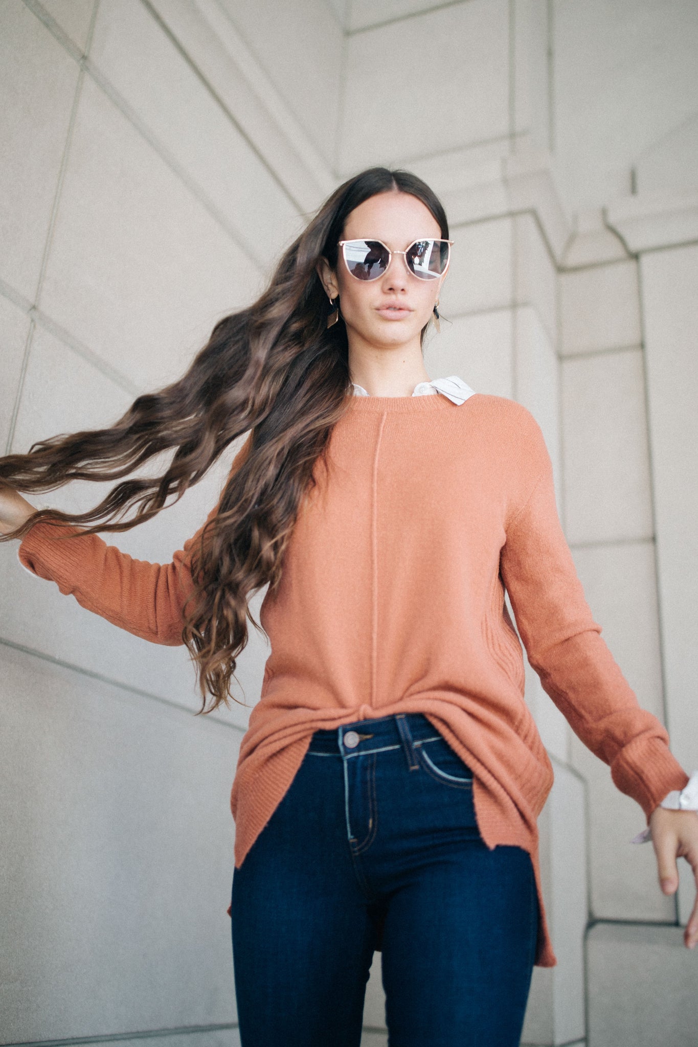 We are ready for any day with the Serina sweater, it is a loose fit with a crew neck and ribbed detailing on the side. It makes for a cozy day in to a stylish night out, pair with a dark or light jean and some flats and you will be good to go.