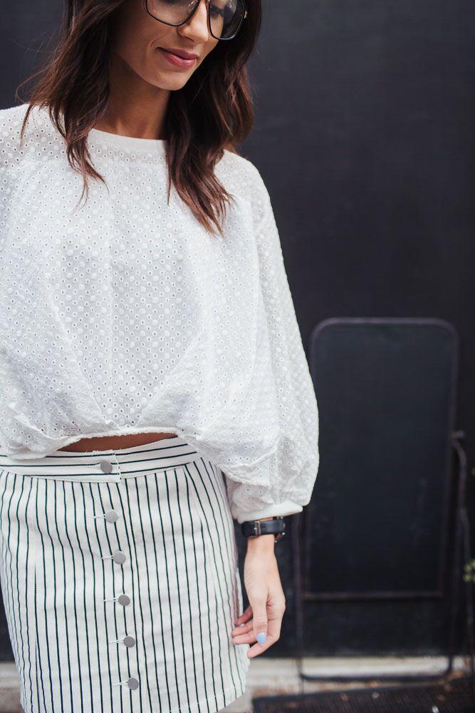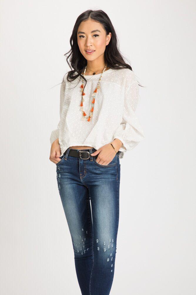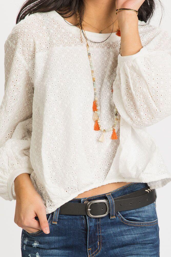 Be a sweet, sweet vision in white with this eyelet lace top!  It features a gathered front, balloon sleeves and a fun, boxy shape.