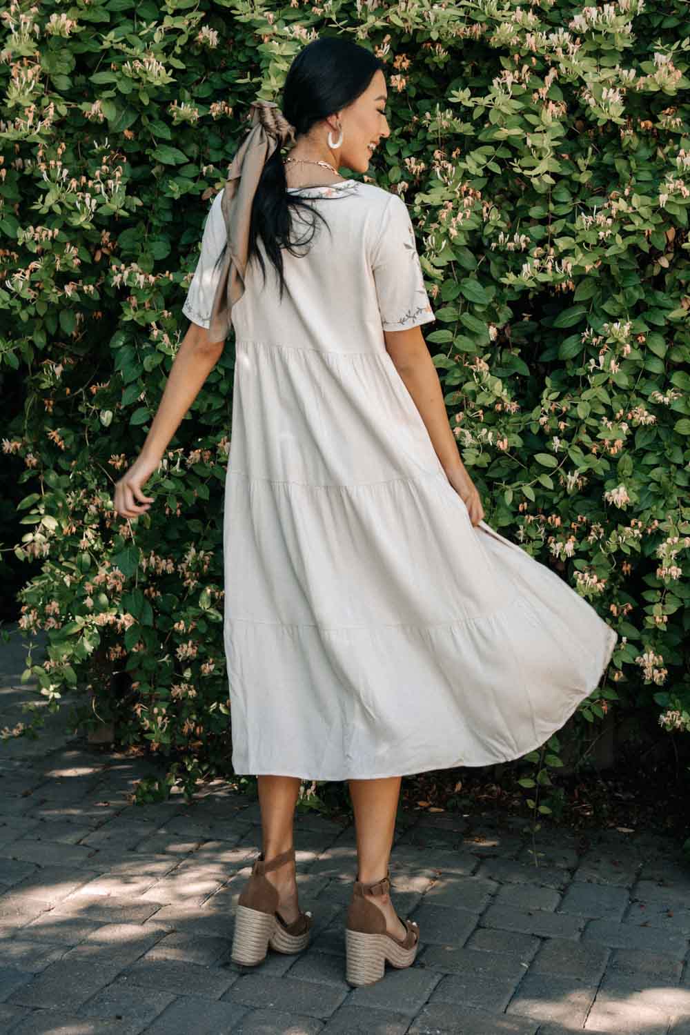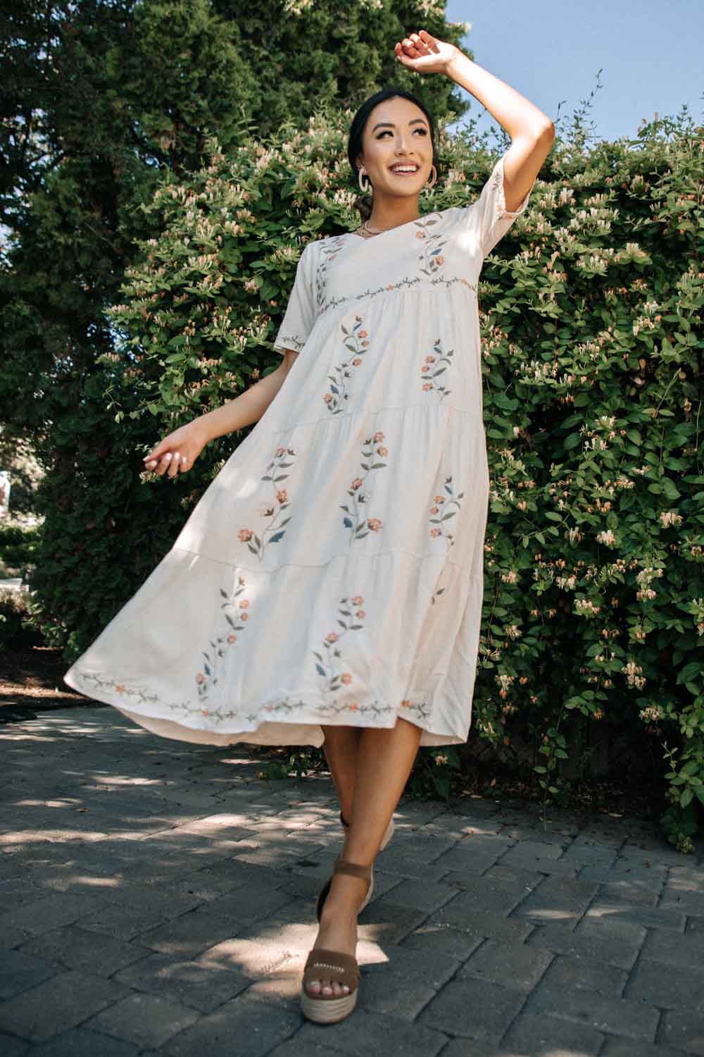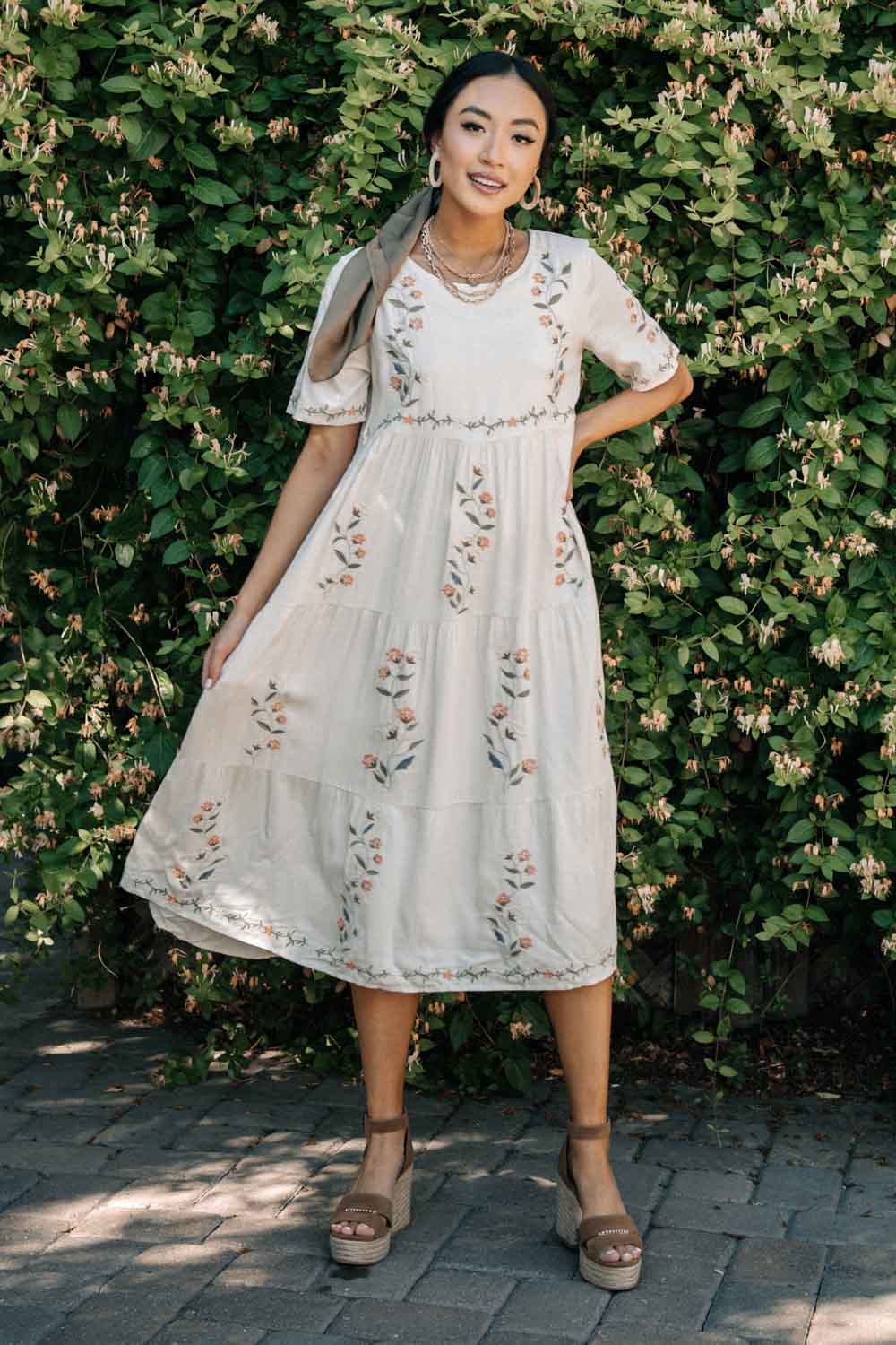 Tiered Embroidered Midi Dress in Ivory