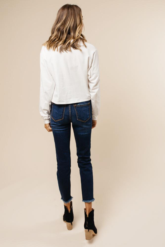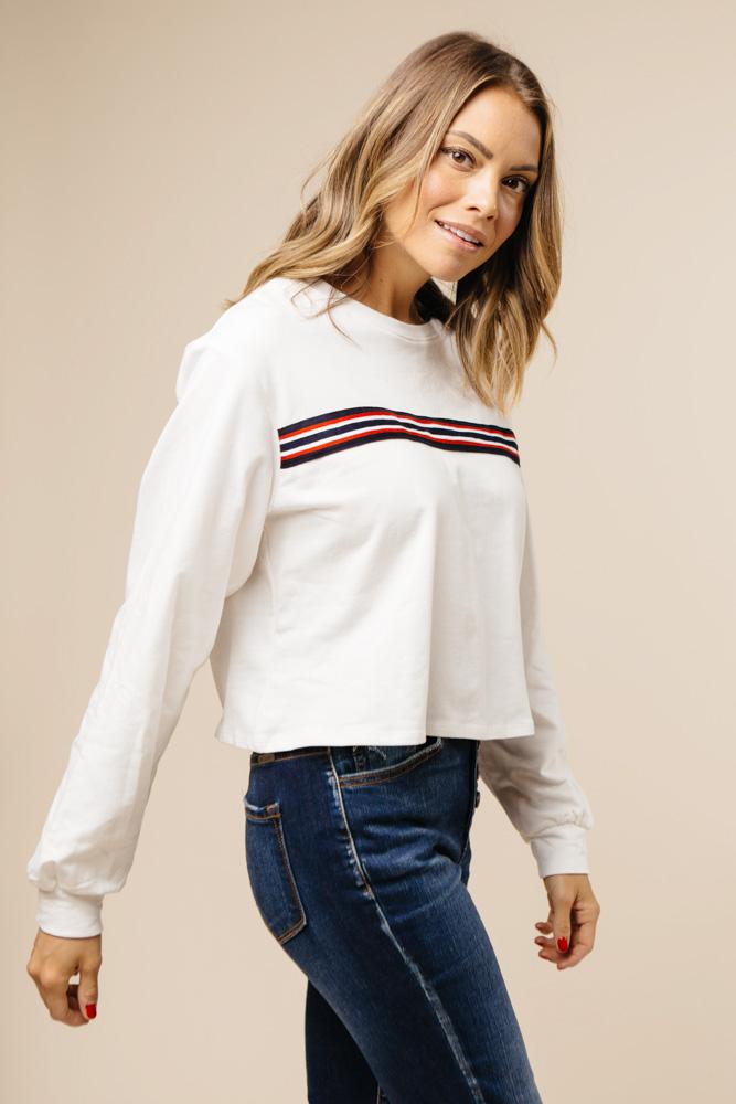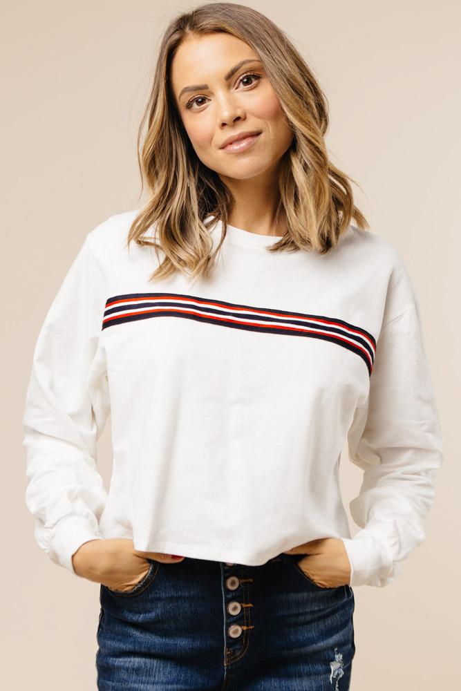 The Torie Long Sleeve Tee is a simple yet trendy piece! Featuring long sleeves, relaxed fit, hip length and an orange, navy blue and white stripe detail across the front. Tuck this into some high waist pants or wear over some fave denim.